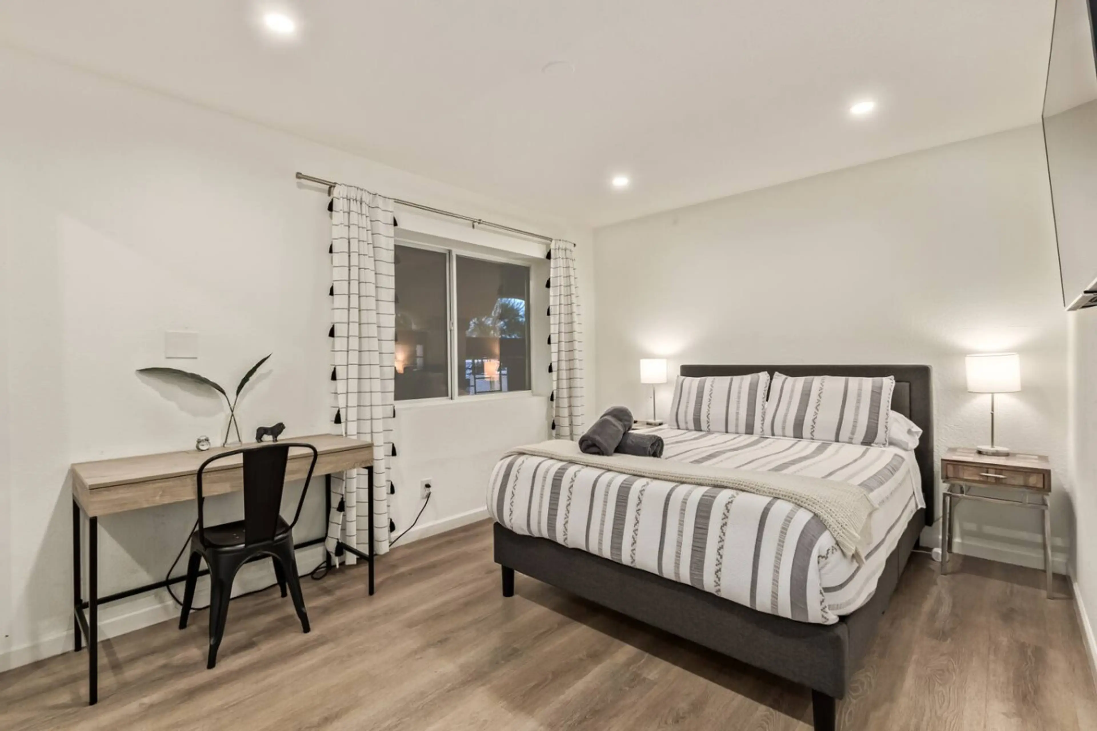 Stay in style at this cozy 2BR home in the heart of Phoenix! Perfect for 4 guests, it’s packed with comfort and modern touches, Smart TVs in every room, a decorative fireplace, a Nest thermostat, and a cute breakfast nook to start your day right. Work from the comfy desk chair or unwind with artful ...