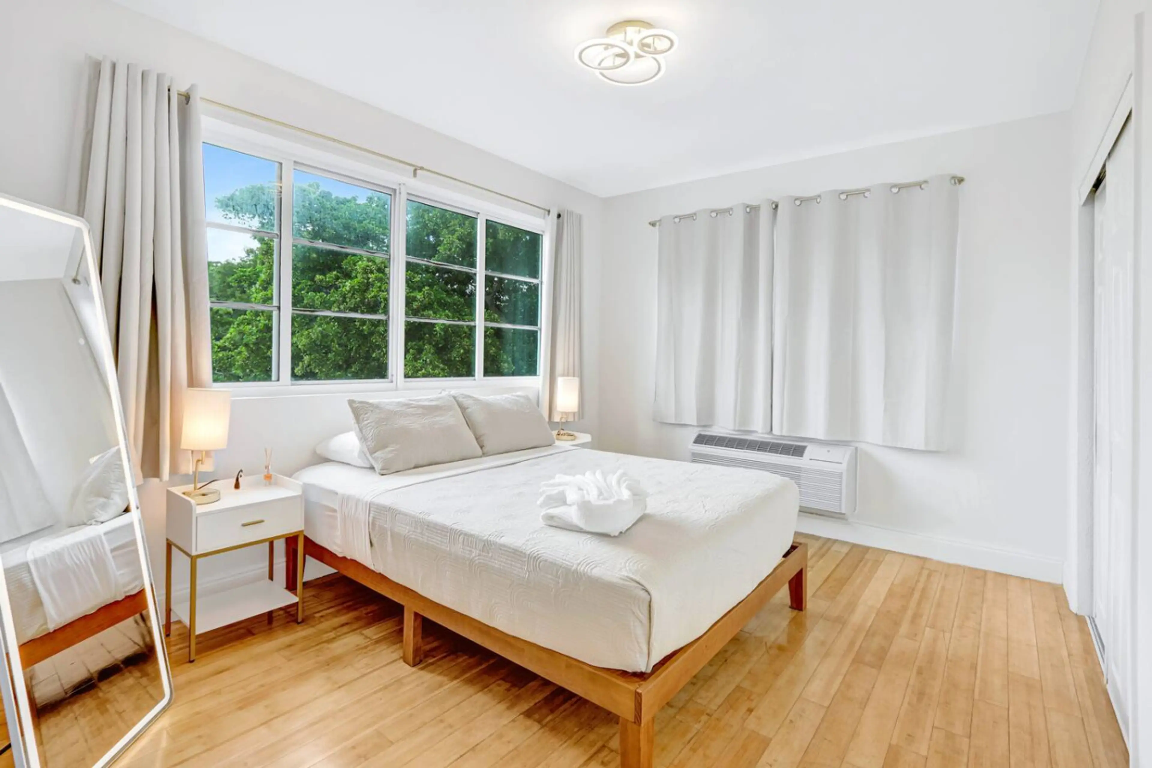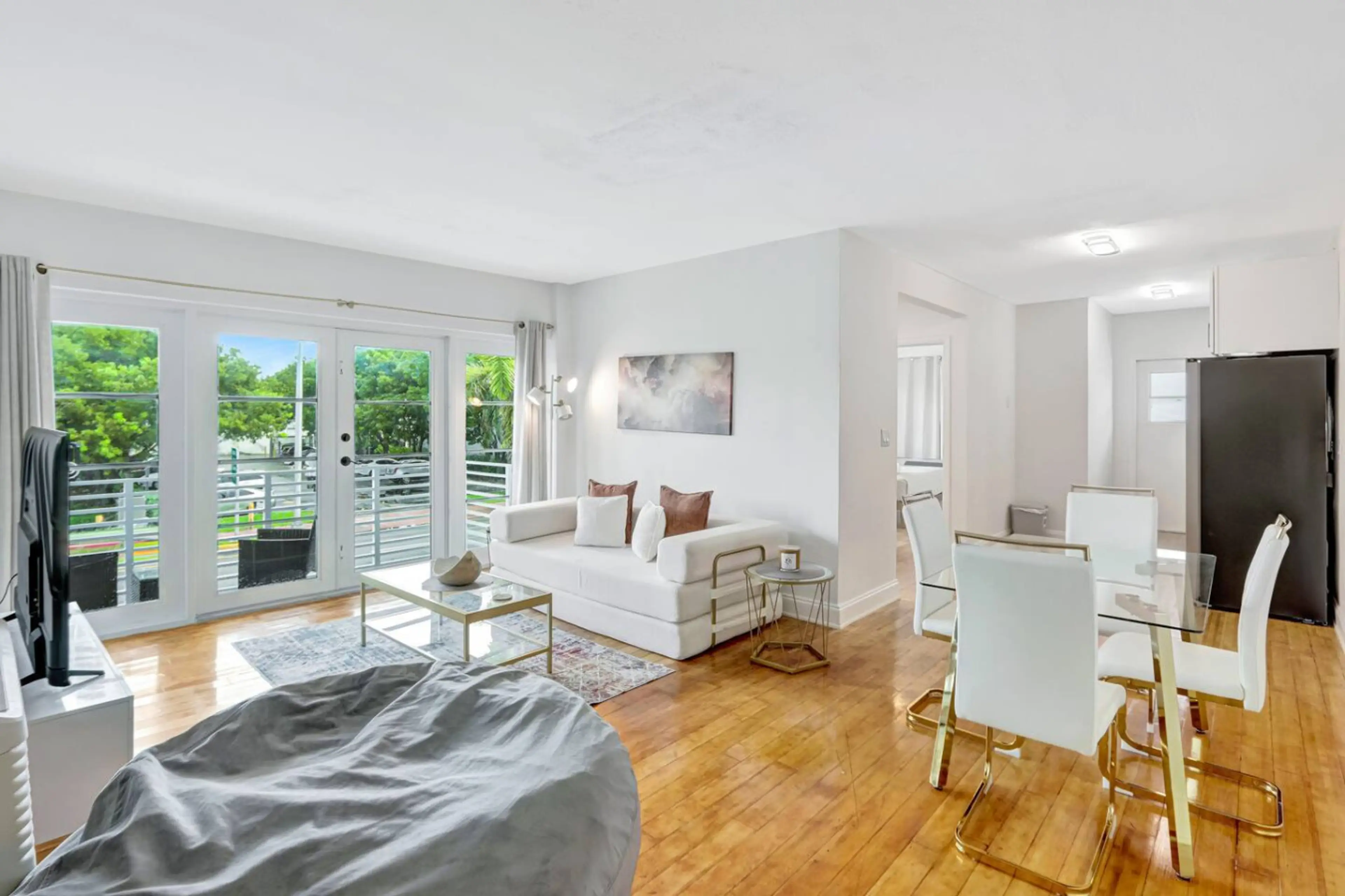 Relax in this bright 1-bedroom Miami Beach apartment that comfortably sleeps 4! The bedroom features a queen bed, and the living room includes a sofa bed. Enjoy a fully equipped kitchen with all-new appliances (no dishwasher), a Smart TV, and a dining table for four. Step out to the balcony with a t...