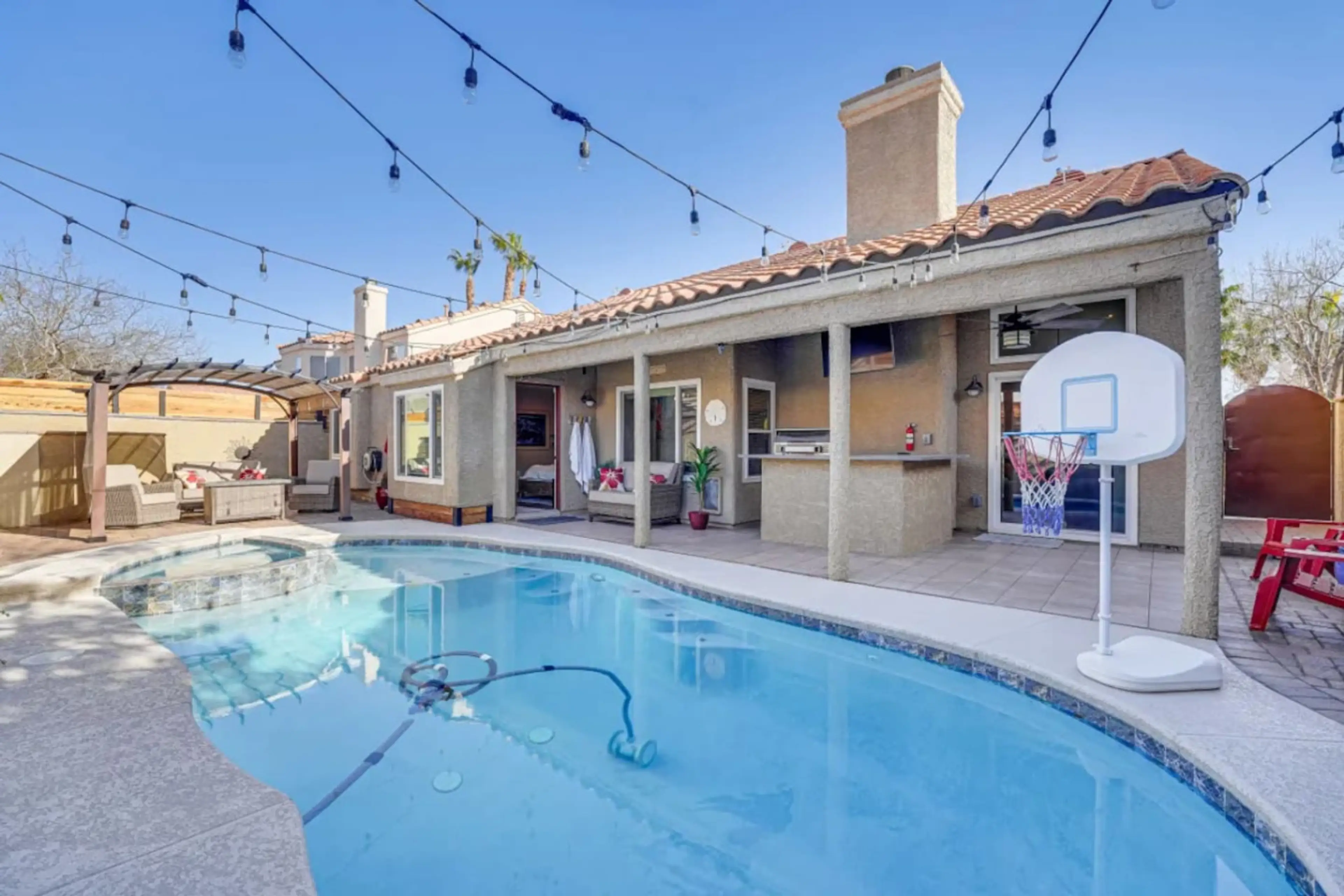 Note: Pool heating is available for an additional $40 per night. Please let me know at least one day in advance if you’d like to add this service. Unwind in this beautifully themed 3BR home with an office/den, private pool and jacuzzi, games room, and all the comforts needed for a relaxing Las Vega...